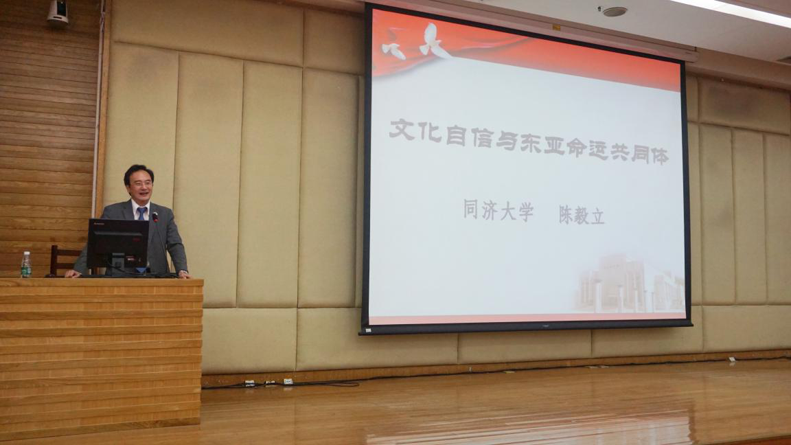 本网讯 11月2日上午,同济大学外国语学院陈毅立副教授莅临我院作“文化自信与东亚命运共同体”主题讲座。讲座在图书馆负一层报告厅举办。学院党委书记周秀娇、副院长杨晓辉、副院长胡瑞、辅导员朱浩文以及我院18级学子参加并聆听了本次讲座。讲座由副院长杨晓辉教授主持。