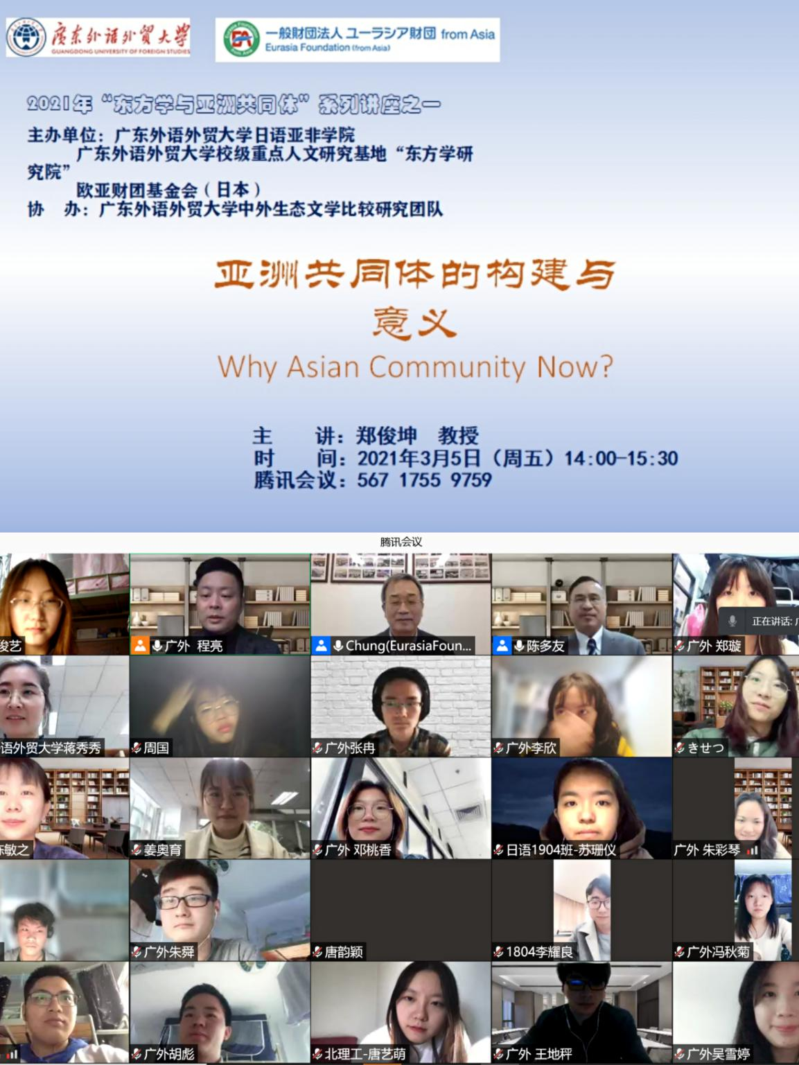 3月5日,由广东外语外贸大学日语亚非学院、广东外语外贸大学校级重点人文研究基地“东方学研究院”及欧亚财团基金会(日本)主办、广东外语外贸大学中外生态文学比较研究团队协办的2021年“东方学与亚洲共同体”系列讲座的第一讲通过腾讯会议在线上举行。本次讲座邀请了欧亚财团基金会首席研究员、日本明治大学郑俊坤教授作为主讲。广东外语外贸大学教务处处长杨晓辉教授,日语亚非学院院长陈多友教授,以及来自我校、上海外国语大学、山东大学、四川大学等50余所高校200余人出席了讲座。讲座由日语亚非学院社会文化系主任程亮副教授主持。