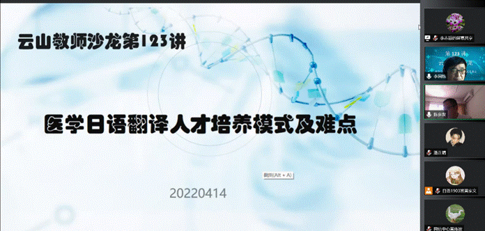 2022年4月14日下午,云山教师沙龙第123讲在线上举行,本次沙龙由学校教师发展中心主办,日语学院、亚非学院(筹)承办,主题为“医学日语翻译人才培养的模式及难点”。讲座邀请西安交通大学李国栋教授主讲,我院陈多友院长、张秀强副院长及翻译系全体教师出席本次讲座,参加此次讲座的学生共200余名。
