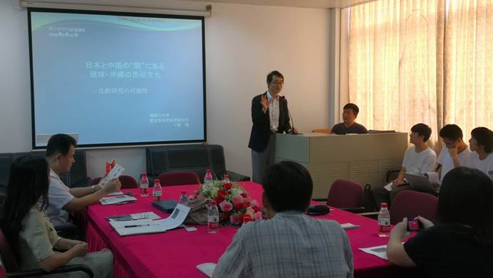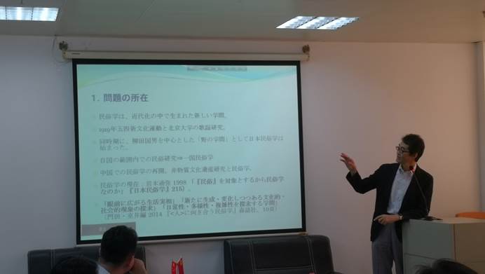 在一段简短的中文自我介绍后,小熊诚教授从中日两国民俗学的发展讲起,指出深受中日两国影响的冲绳是日本比较民俗学的重要研究对象。而后,又对冲绳的民俗研究进行了梳理,并着重介绍了日本民俗学创始人柳田国男的冲绳研究,柳田在其晚年著作《海上之路》中提出了中国南方的稻作技术很可能是通过海路经由冲绳逐渐北上传播至日本这一假说。讲座中,小熊诚教授还用丰富的田野调查中拍摄的图片为各位与会人员展示了冲绳的风土人情。最后,小熊教授指出,在对近来日本近代琉球史进行重新审视的背景下,冲绳民俗研究应以比较研究为主体,从多元化的民俗视角进行研究。