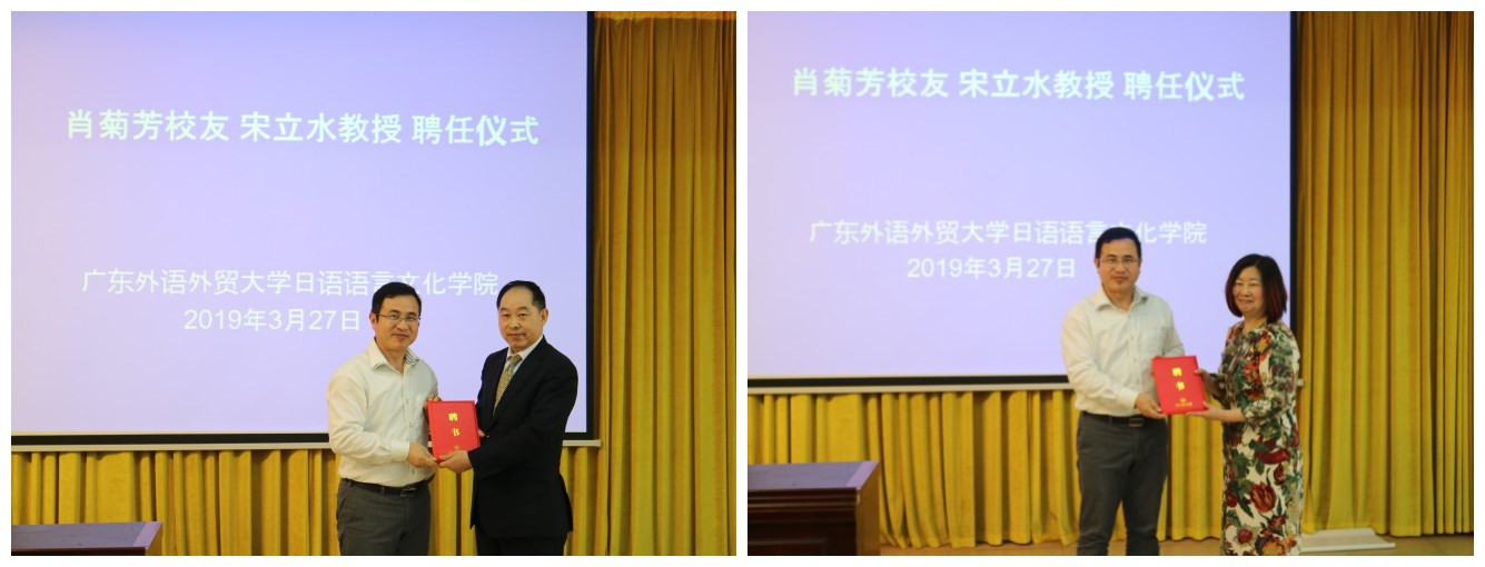 讲座前,陈多友院长为肖菊芳校友颁发我院“校外导师”聘书,为宋立水教授颁发我院“客座教授”聘书。
