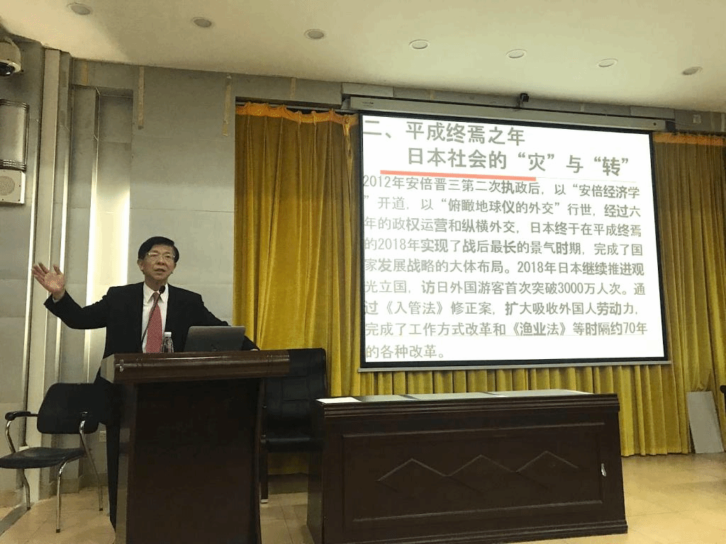 汪鸿祥教授首先回顾了平成时代的变化。他表示,自己就是在平成初年去的日本,平成时代正好和他在日本的时间重合在一起。汪教授指出,平成时代日本社会经济政治等各方面都发生了很大的变化,同时他认为在这一时代虽然日本受到各种冲击和压力,但并没有停滞,而是进入了一个调整时期,是为了实现经济软着陆并着手经济转型和产业升级的年代。他总结出平成时代给我们以下的启示:1,首先是要反战和平;2,社会安定;3,要谋求发展。接下来,汪教授向大家介绍了代表平成年代日本社会的两个汉字:“灾”和“转”,总结出这两个字“反映了平成终焉之年日本社会的担忧与期盼并存的状态,反映了日本官民对2018年日本社会变化的矛盾而统一的认识”,认为改元换代会给日本的改变带来一种契机。其后,他介绍了平成终焉之年日本人意识的一系列变化,如参与政治活动的意识日益冷淡、对结婚和生育等的意识变化,男女平等观念日益增强等。汪教授认为日本的“低欲望社会”是一种“轻文明”的体现。