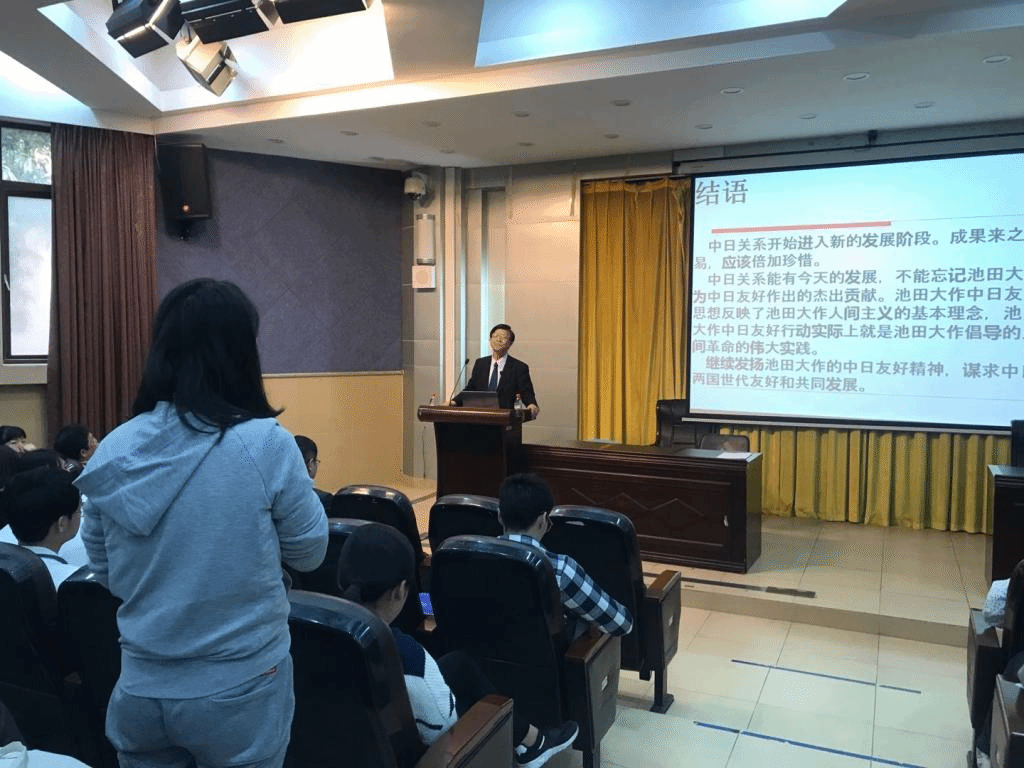 后半部分,汪教授通过池田大作先生的实践活动及思想,总结出中日关系问题的根本在于两国之间的相互不理解,认为双方存在很多认知差距。对此,他提出民间交流尤其是青少年的交流活动拥有优良的传统,促进民间交流有利于推进两国友好关系的发展。同时,他还提到希望广外日语专业的同学也能够积极参加中日青少年间的交流活动。演讲结尾,汪教授进一步提出,如何促进两国和平安全友好发展是双方的一个重大课题,推进中日互惠共赢才是新时代中日关系发展的方向。
