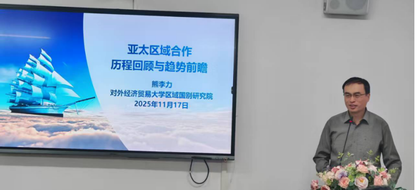 11月17日,由广东外语外贸大学教师发展中心主办、日语语言文化学院承办的著名教授论坛第716讲在白云山校区第一教学楼333室顺利举行。本次讲座由对外经济贸易大学区域国别研究院执行院长、《日语学习与研究》杂志主编熊李力教授担任主讲,讲座主题为“亚太区域合作历程回顾与趋势前瞻”。讲座由日语语言文化学院院长杨晓辉教授主持。