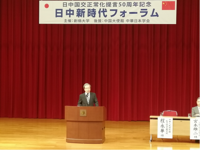 本网讯:9月8日,应日本国创价学会暨创价大学邀请,中国中华日本学会代表团一行15人访日,并出席中日邦交正常化倡言50周年纪念大会——中日新时代论坛。当日上午10时大会在创价大学本部大楼国际会议厅拉开序幕。开幕式上,代表团团长中国社会科学院日本研究所所长、全国政协委员高洪研究员,创价大学校长马场善久教授,中国社会科学院日本研究所党委书记刘玉宏研究员分别致辞。复旦大学原党委副书记王荣华教授、东日本国际大学客座研究员西园寺一晃教授、北京大学日本研究中心贾蕙萱教授以及创价大学和平问题研究所玉井秀树教授分别作基调演讲。论坛由创价大学主办,中华人民共和国驻日本国大使馆与中华日本学会为指导单位。来自中日两国高校及研究机构的150余名学者与会。