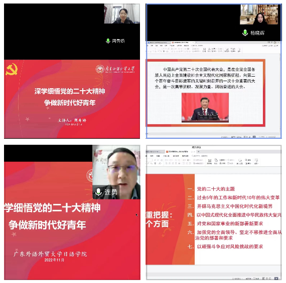 此次宣讲从学习党的二十大报告内涵、贯彻落实党的二十大精神等方面对党的二十大精神作了系统讲解,并结合实际和案例进行阐释。学院党委书记周秀娇寄语广大研究生要认真学习领会党的二十大精神,将个人理想与国家的前途命运紧密结合在一起,自觉扛起时代重任,珍惜时光,提升本领,努力成为国家建设的合格接班人。学院院长杨晓辉阐述了教育、科技、人才对全面建设社会主义现代化国家的基础性、战略性支撑作用,勉励同学们要脚踏实地、做好规划,在思想上和专业上全面淬炼。学院党委副书记连勇结合实际讲述了党为民造福的初心使命,号召高年级同学切实增强学习贯彻的政治自觉、思想自觉、行动自觉,筑牢理想信念、扎实掌握本领。学院组织员黄晓梅强调党的二十大报告是党和人民智慧的结晶,是马克思主义的纲领性文献,青年学生要认真领会,并认真贯彻到学习和生活的实际行动中去。