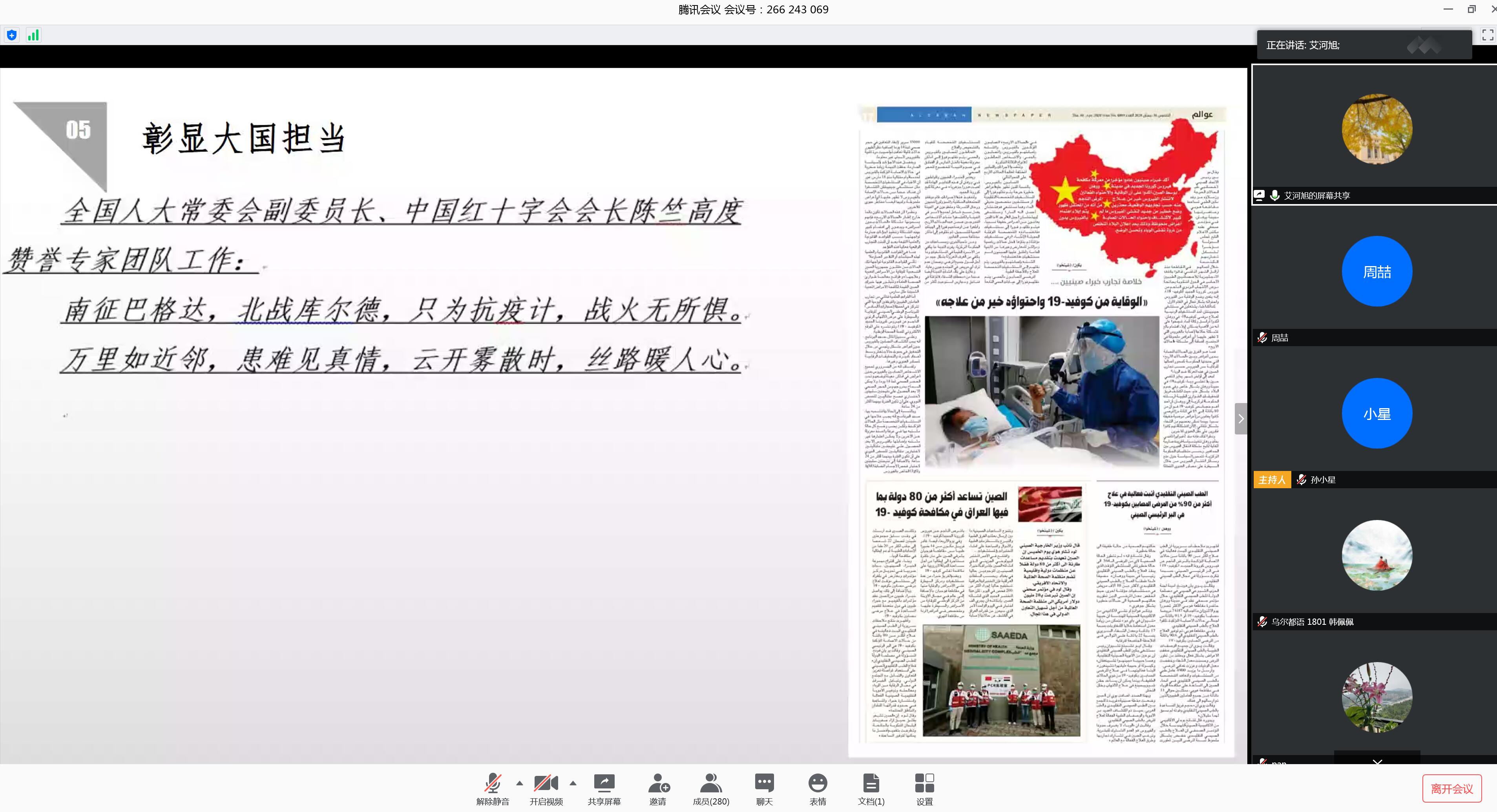 本网讯5月21日下午,我校教师艾河旭赴伊抗疫事迹报告会暨线上思政宣讲线上举行,党委宣传部、党委教师工作部为艾河旭颁发思政宣讲团“国际合作抗疫彰显大国担当”专题特聘宣讲员证书。活动由党委宣传部、党委教师工作部,机关党委,日语语言文化学院、亚非语言文化学院(筹)党委主办,近300名师生党员参加线上活动。校党委常委、副校长王廷惠出席会议。