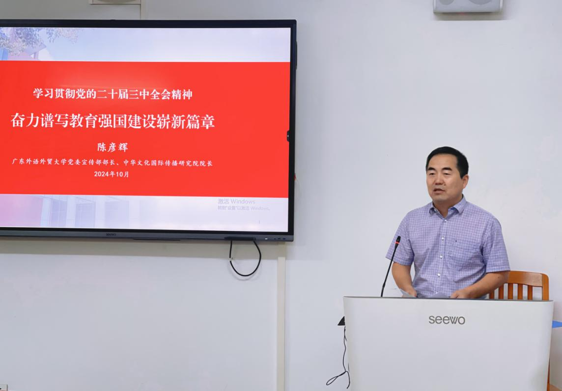 陈彦辉紧密围绕党的二十届三中全会的核心议题和重大部署,结合当前国内外形势和学校发展实际,系统阐述了全会精神的重要意义和实践要求。在辅导过程中,陈彦辉强调学习贯彻党的二十届三中全会精神,要在深刻领会和把握进一步全面深化改革的重要性和必要性、主题、重大原则、重大举措、根本保证上下功夫。他从“六个必然要求”、“四个迫切需要”、推进中国式现代化、“六个坚持”、“七个聚焦”、党的领导等方面进行了深入浅出的讲解。他指出,凝聚人心、汇聚力量,是实现新时代新征程党的中心任务的迫切需要,对于推进国家治理体系和治理能力现代化具有重要意义。全体教职工要深刻认识党的二十届三中全会的重大历史意义和现实意义,准确把握新时代全面深化改革的总目标和任务,切实把思想和行动统一到党中央的决策部署上来,积极参与学校各项工作,为学校发展贡献智慧和力量,为教育强国建设贡献广外力量。