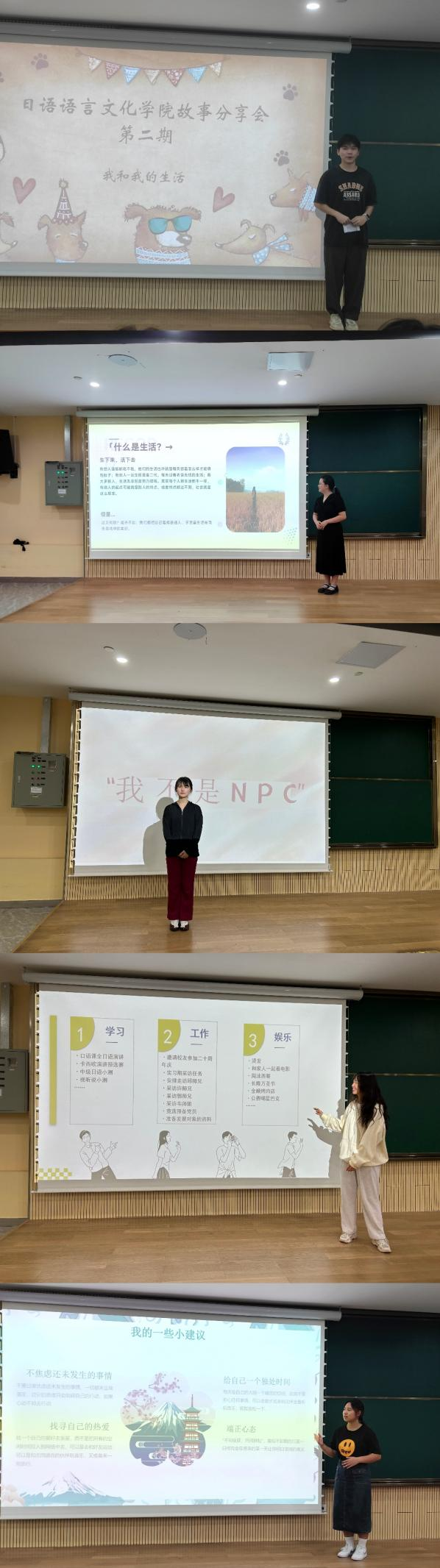 出席本次活动的学院党委副书记连勇在本次活动总结到:“故事分享会是日语学院心理健康教育特色品牌活动,通过日常生活故事的学习和分享,引导学生热爱生活,提升心理抗压能力,营造积极向上的学习环境。同学们在大学的生活中难免遇到压力,要学会如何面对和调节压力,好好珍惜大学的时间,同时要利用大学这个平台锻炼综合素质,让大学生活更加充实多彩。”