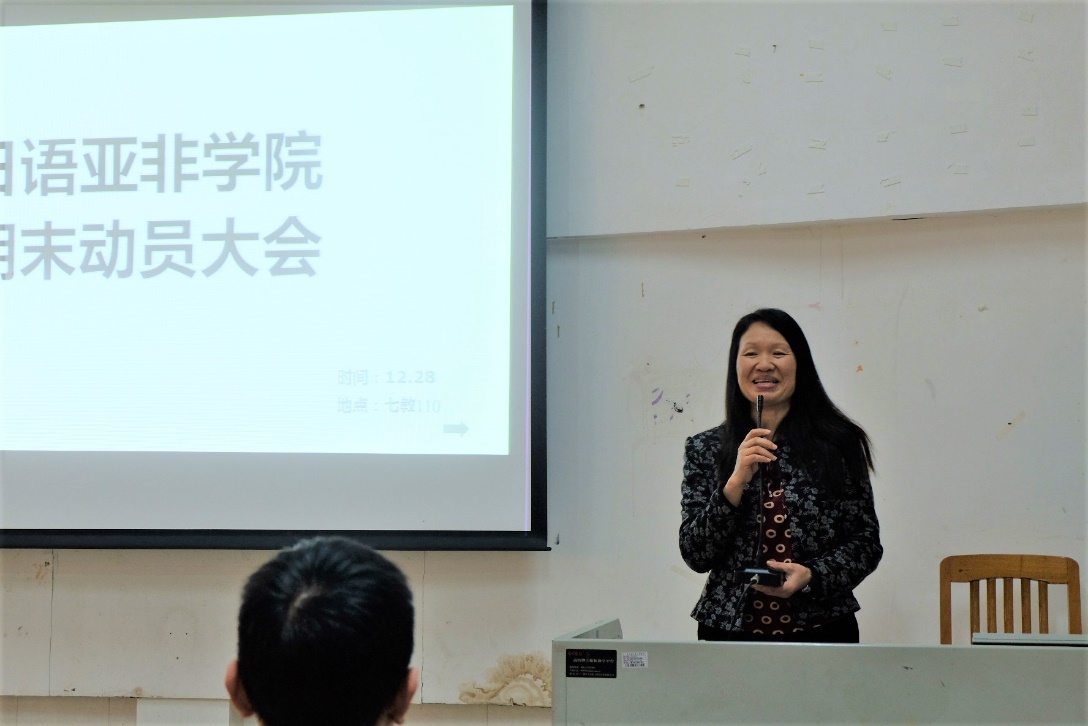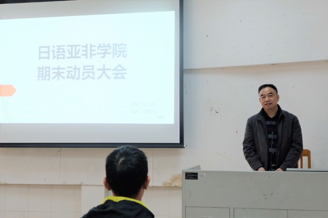 本网讯 12月28日下午,日语学院、亚非学院(筹)2017级、2018级期末动员大会在第七教学楼110室顺利召开。莅临动员大会现场的有学院党委书记周秀娇、党委副书记曾智鹏、学院辅导员沈永英及朱浩文。本次动员大会旨在总结本学期工作、借鉴过往经验、展望更好的未来。