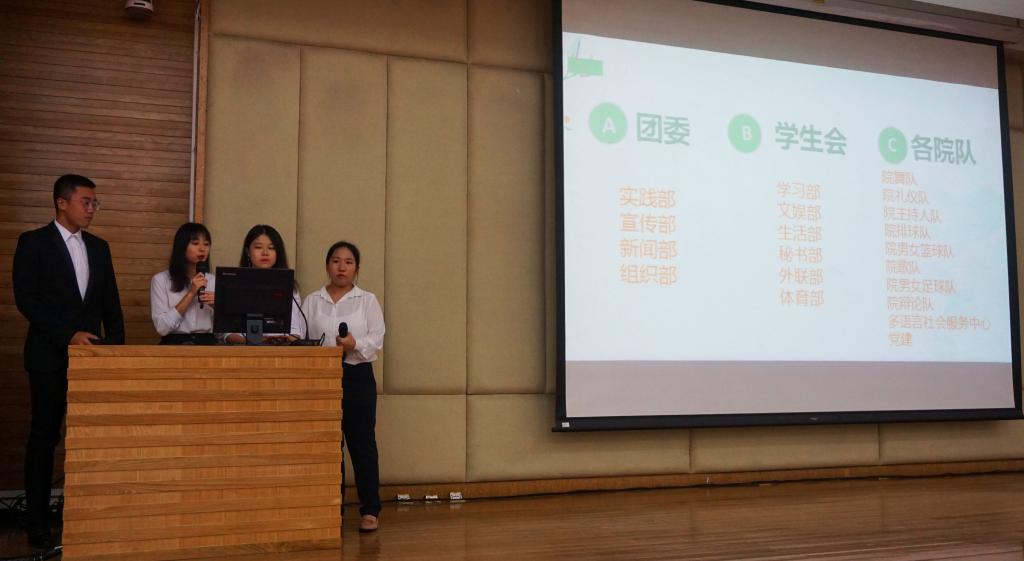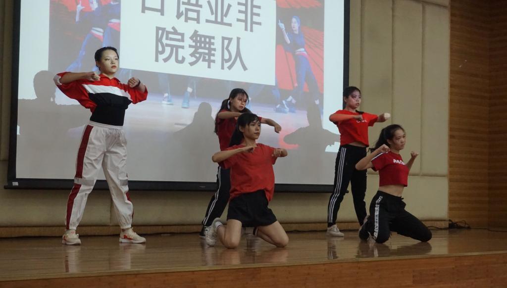 尔后,院舞队、院礼仪队、院主持人队、院排球队、院篮球队、院歌队、院足球队、院辩论队、多语言社会服务中心依次上台进行宣讲。院舞队与院歌队还带来精彩表演,把整个宣讲会带入高潮。
