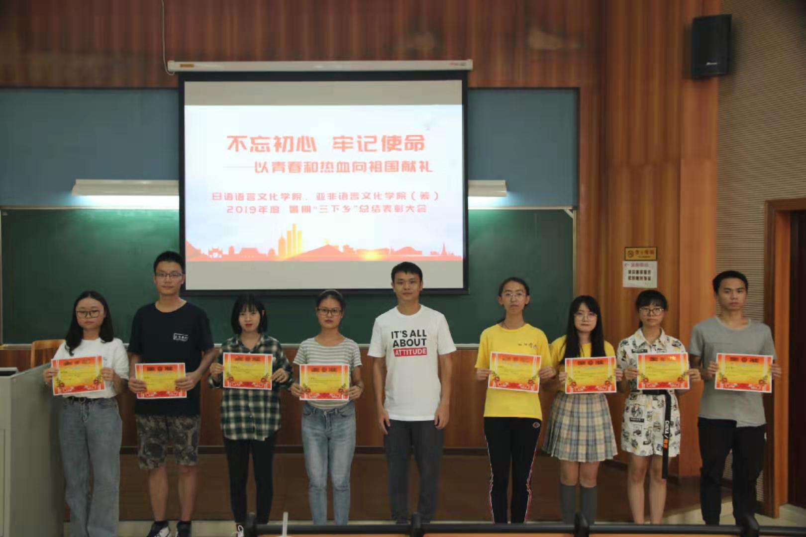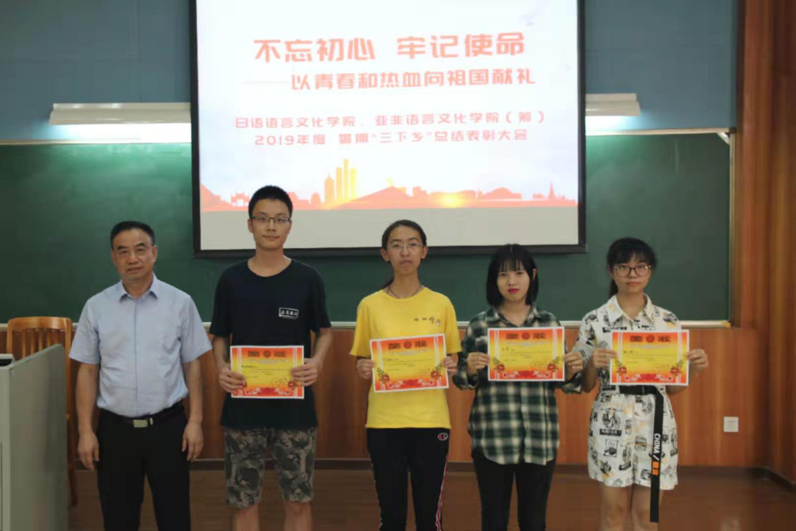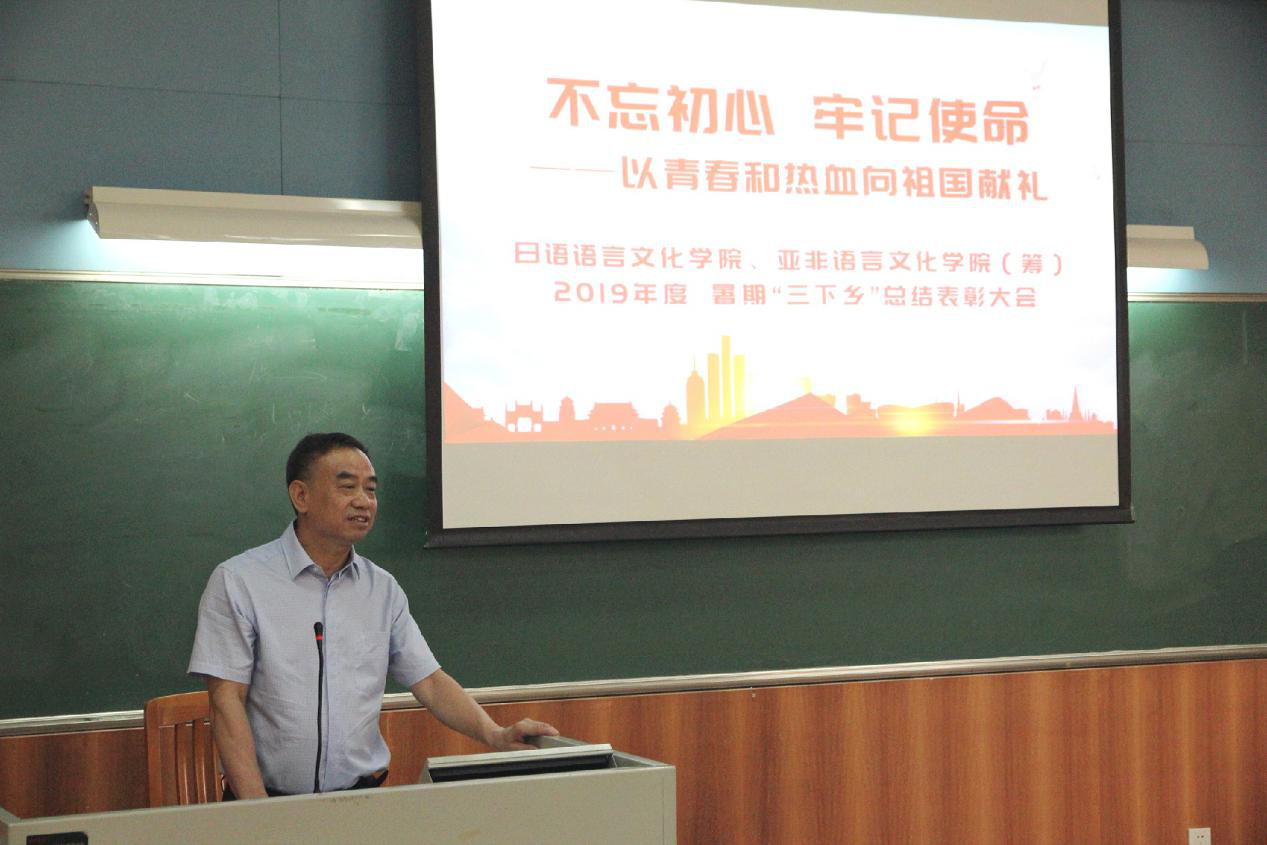 本网讯 为增强当代大学生对新时代乡村发展的认识,进一步鼓励大学生以所学知识服务与贡献社会,10月10日上午,日语学院、亚非学院(筹)院团委于七教107开展以“不忘初心、牢记使命——以青春和热血向祖国献礼”为主题的暑期三下乡总结表彰大会。出席本次活动的有:院党委副书记曾智鹏、院团委书记朱浩文、辅导员许楚欣、孙小星以及日语亚非学院2019级各班学生代表。