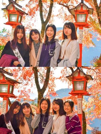 除了课程以外,综合课老师还为我们安排了丰富的课外活动,最令我印象深刻的莫过于红叶季节与综合课老师一起参加了鞍马寺的和平祈祷活动。留学过程中,综合课的山田老师为我们安排了一次特别的课程——体验鞍马寺的和平祈念仪式。11月的那天早上,在老师的带领下,我们来到了鞍马山,乘着秋意,踏着金色的、深红的、铺满山路的叶子,在一路的欢声笑语中登上了山顶,来到了鞍马寺。山上的空气很清新,连同鞍马寺的氛围一起,带给我一种神圣而庄严的感觉。在寺庙外观赏红叶、稍作歇息之后,我们拿到了参加仪式的用具——一盏莲花状的烛灯,和老师一起踏进了寺庙内部。第一次进到以往只能在外面参观的仪式中心地,我想大家心中涌现的是夹杂着好奇与紧张的兴奋;而端着点燃的烛灯,听着方丈和唱诗班的祷告词时,空气中便仿佛只剩下庄严和神圣。和平祈念仪式结束之后,我们有幸留在寺里吃了斋饭。虽说是斋饭,除了日本传统点心,也有面包和蛋糕之类的食物,而且在吃饭的同时,还能欣赏到演奏的音乐以及唱诗班的歌声,可谓是各种意义上的“丰盛”了。这是我在留学过程一次珍贵的的体验,感谢山田老师给予我们这样的机会,相信这次经历能让我对日本文化有一种全新的、更深的理解。